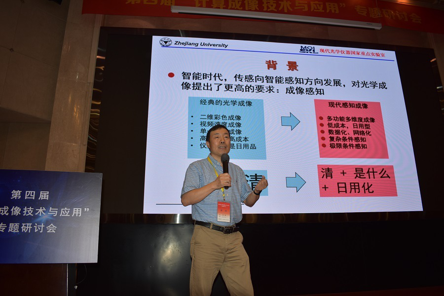 刘旭教授,以“结合计算的光学成像技术”为题,从光场的角度论述光学成像的实质,突出光学成像中的光学调制、解调技术,并以超分辨移频成像、高空间分辨超光谱成像等新技术,说明压缩感知、深度学习技术对传统光学成像的重大影响,以及对传统光学成像能力的突破。