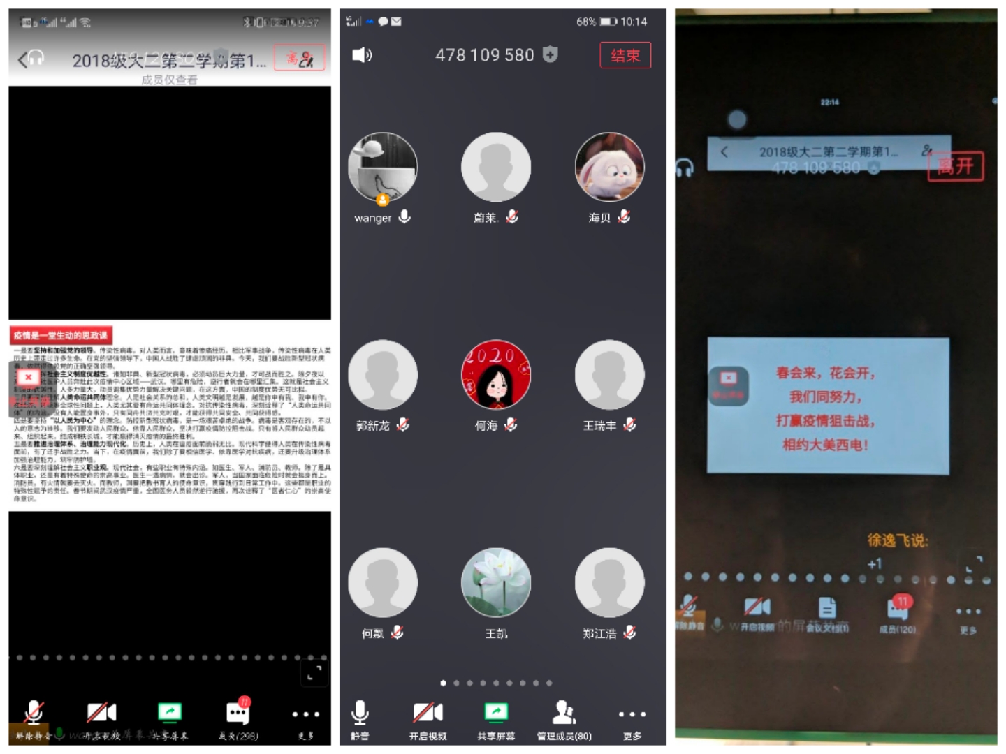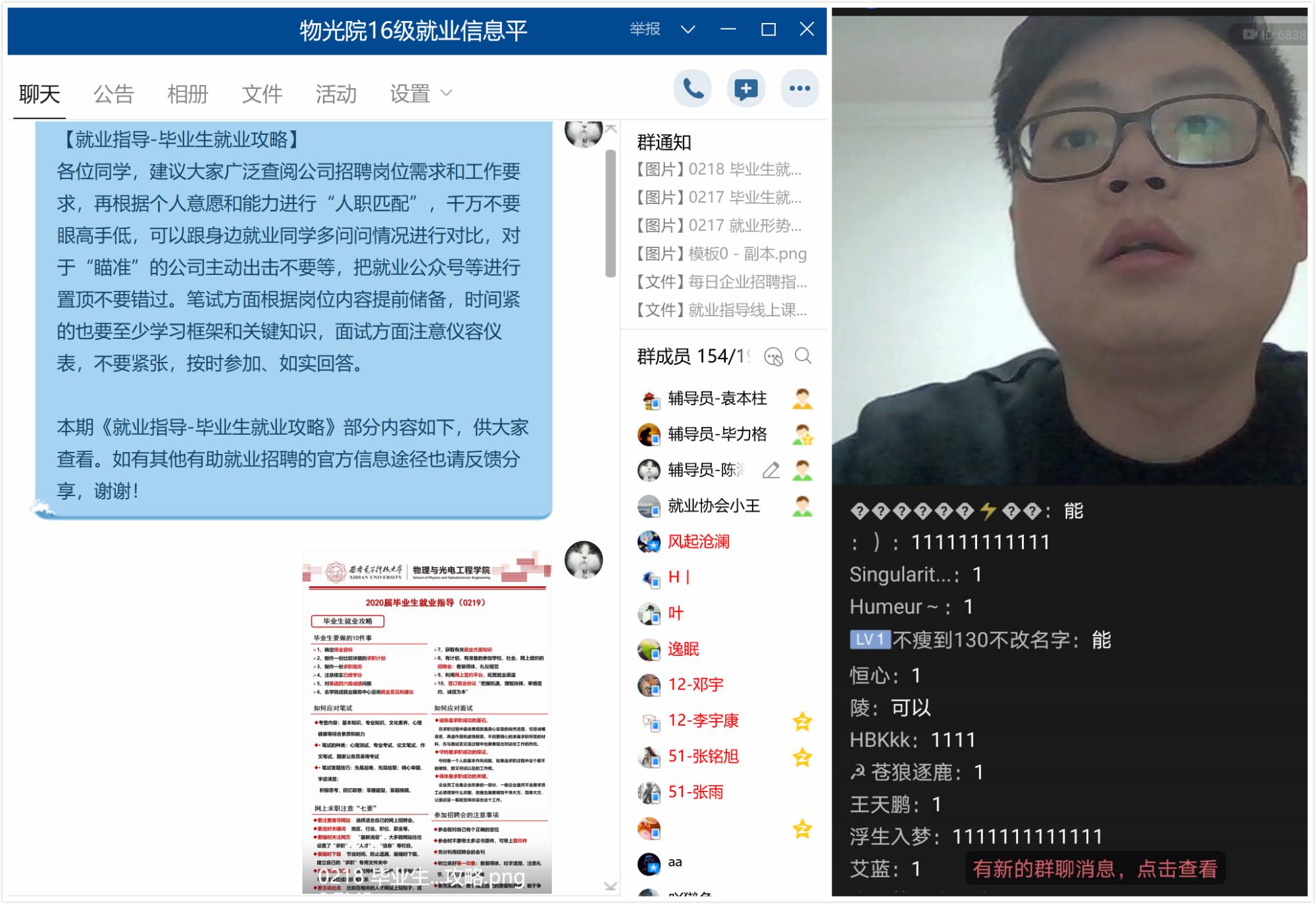 公司各年级通过不同平台,组织了线上“晚点名”,开展抗“疫”教育与开学动员教育工作。各年级辅导员通过分析了当前疫情形势、带来的挑战和对大家的要求,鼓励大家调整好个人状态,为新学期明确目标,完成好学业任务。2020新学期的“云”点名为大家开启了一个难以忘怀的新学期,大家也纷纷表示,开学“晚点名”后会以一个新的状态来应对这个难忘的学期。