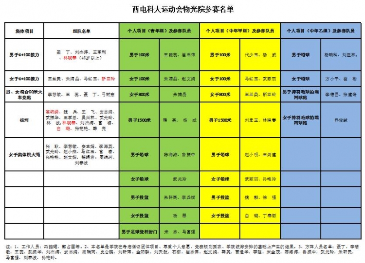 集团工会于4月28日下发了《美加墨世界杯官网2015年教职工运动会竞赛规程》,物理与光电工程公司积极响应,并于当日下午召开公司各系室工会组长会议进行了全面动员,同时传达了教职工运动会的竞赛安排、项目分组、竞赛办法等,并对各系室的组织报名、选拔、训练等具体工作做了详细部署。公司各系室报名积极踊跃,各参赛项目的报名人数均超限报名额,经过近一周的队员协商选拔,公司在尊重个人意愿、保证团体项目、争创优良成绩的基础上,最终形成了《西电科大运动会物光院参赛名单》,具体情况如下。