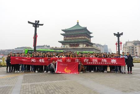 (通讯员:仵梦童)挑战自我,助力彩协,放飞希望。为响应习近平总书记在“十九大”中提出对“2020全面脱贫”的要求,同时锻炼老员工生存能力,提高他们的社会适应性,11月12日,由共青团物理与光电工程公司委员会承办的“一元钱城市生存挑战赛”在西安市钟楼商业区正式拉开帷幕。通过本次活动,将筹集的资金部分捐赠给“彩云协会”,用于为云南省昭通市镇雄县常院小学的员工购置书架等学习用品,为山区脱贫贡献一份力量。本次活动有来自各公司的14支队伍共56名员工参加比赛。参赛的所有同学用仅有的一元钱,与工作人员们一起从钟楼出发,走向社会,切实地感受来自生活中方方面面的挑战。