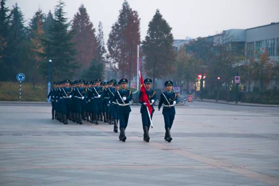 早晨6点30分左右,公司17级新生在规划好的场地上列队完毕,立正站好。7时整,国防生们迎着朝阳,踏着矫健的步伐,庄严地护卫五星红旗进场。随后,旗手则在国旗杆前手执五星红旗一角肃立,雄壮豪迈的《义勇军进行曲》响彻整个礼仪广场,老师和同学们行注目礼,国防生们行军礼,全场弥漫着庄严肃穆的气息。