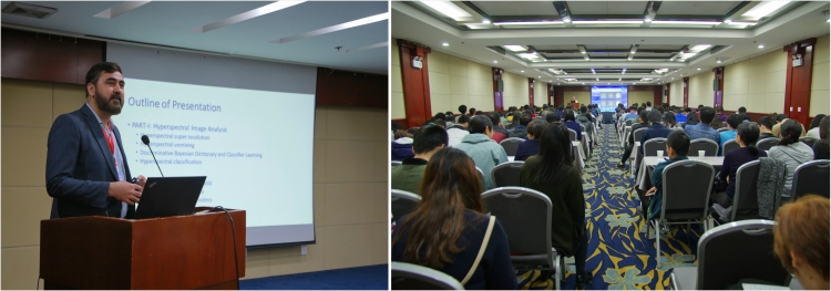 开幕式结束后,来自美国马里兰大学的基地海外学术大师Chein-I Chang教授率先为各位师生做了题为“Hyperspectral Magnetic Resonance Imaging”的学术报告,报告主要就高光谱在磁共振成像方面的理论研究和工程应用做了详细的讲解。随后,Yen-Chieh Ouyang教授,Xiuping Jia高级讲师和Ajmal Mian副教授分别做了题为“Hyperspectral Magnetic Resonance Imaging Application: Measure of Breast Mass Using Intra-Voxel Incoherent Motion (IVIM)”,“Hyperspectral Image Interpretation: Hard or Soft Classification with SVM”和“Machine Learning for Hyperspectral Image and Human Action Analysis”的报告,分别阐述了关于高光谱磁共振成像应用、高光谱遥感图像分类方法、基于机器学习的高光谱成像和人类行为分析的研究成果。