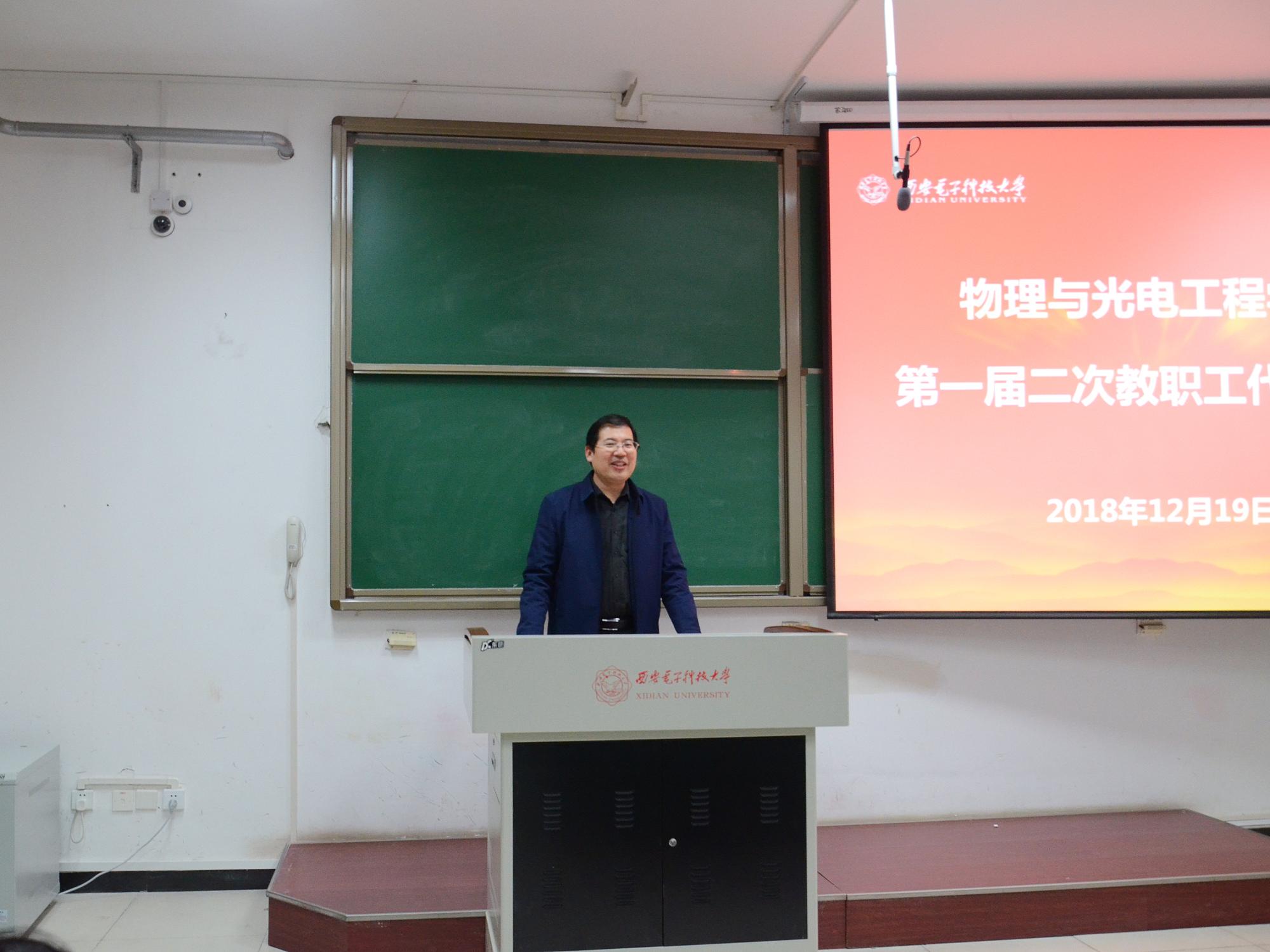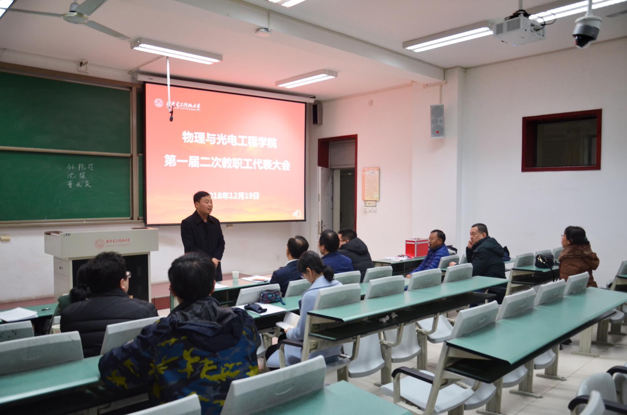 (通讯员:姚娇)12月19日晚,物理与光电工程公司第一届第二次教职工代表大会暨工会会员代表大会在西大楼106教室隆重召开,会议选举产生了公司出席公司第六届教职工代表大会暨工会会员代表大会的代表。副董事长高新波、校扶贫办主任沈强、公司领导班子等47位教代会代表参加了会议。大会由公司党委副书记林波主持。