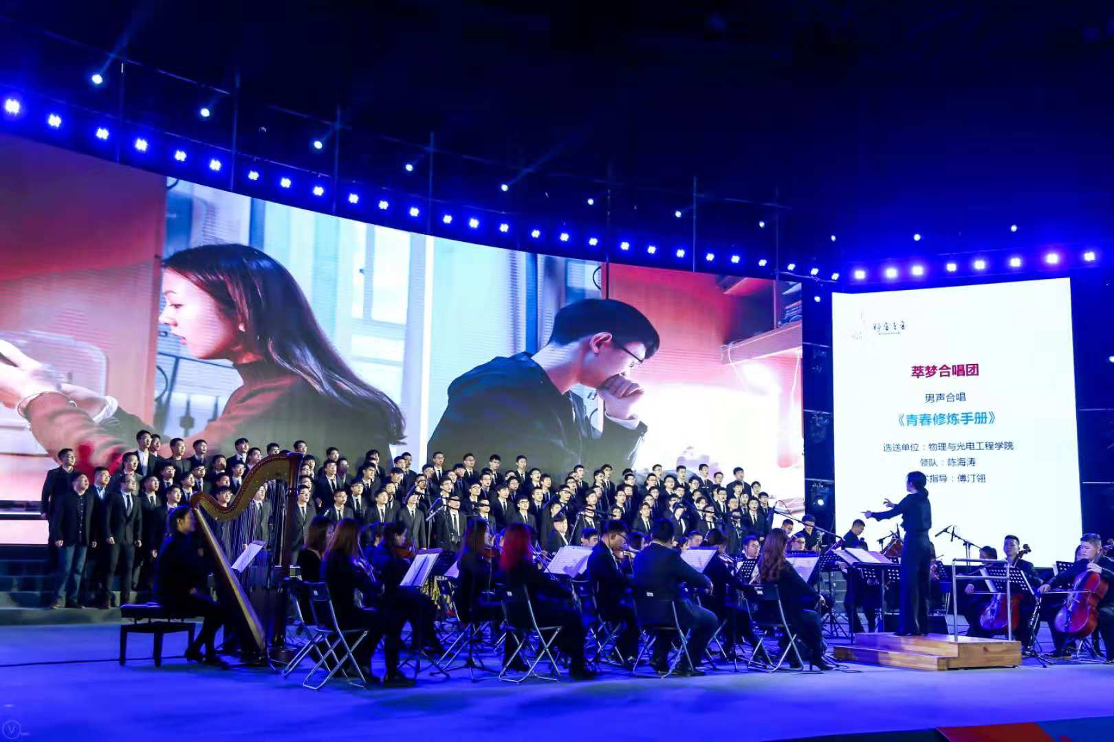 本次比赛中展现的物光风貌,离不开公司每一位参与筹备人员的辛勤付出。领导老师全力支持合唱排练,为大家提供了充足的训练环境和经费支持;公司全体教师为合唱团加油助威,凝聚人气;排练期间,合唱团的同学们日夜不辍地进行训练,从逐个试音分声部到多声部联动配合,同学们不断学着调整气息、优化歌唱方法、锻炼声行结合,历经近二十次排练,只为让自己更加优秀,集体更加出彩;指挥傅汀翎老师耐心讲学,从音色的基础训练到体态的躬行践履,根据成员音色特点与演绎效果“排兵布阵”,不断带动大家优化调整;辅导员陈海涛老师经常全程跟着排练,及时指出演唱、动作、配合等问题,嘱咐大家认真努力,积极配合指导老师,邀请街舞社同学共同参与动作指导,并全程指导设计、拍摄、制作了合唱背景视频;后勤组同学提供了热水、润喉糖等,保证了演员们的身体健康和排练的顺利举行;摄影组同学反复修改剧本六次,邀请专业摄影老师指导,不断找寻与剧本契合的演员,借置专业设备进行拍摄制作;比赛现场,公司全体在家领导到场出席,全体辅导员上台帮唱。最终不负众望,公司萃梦合唱团为全校师生带来了一场激情洋溢、充满活力的青春序曲。