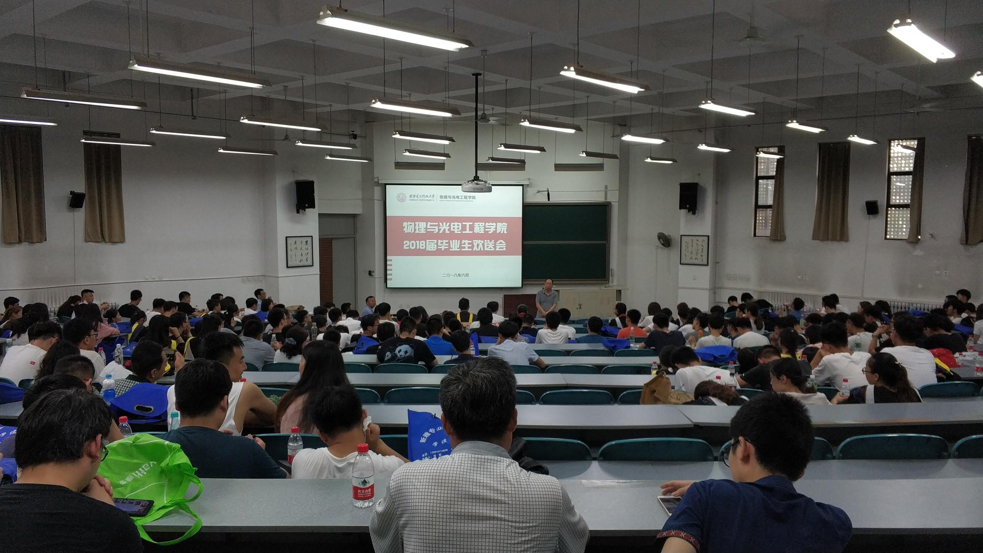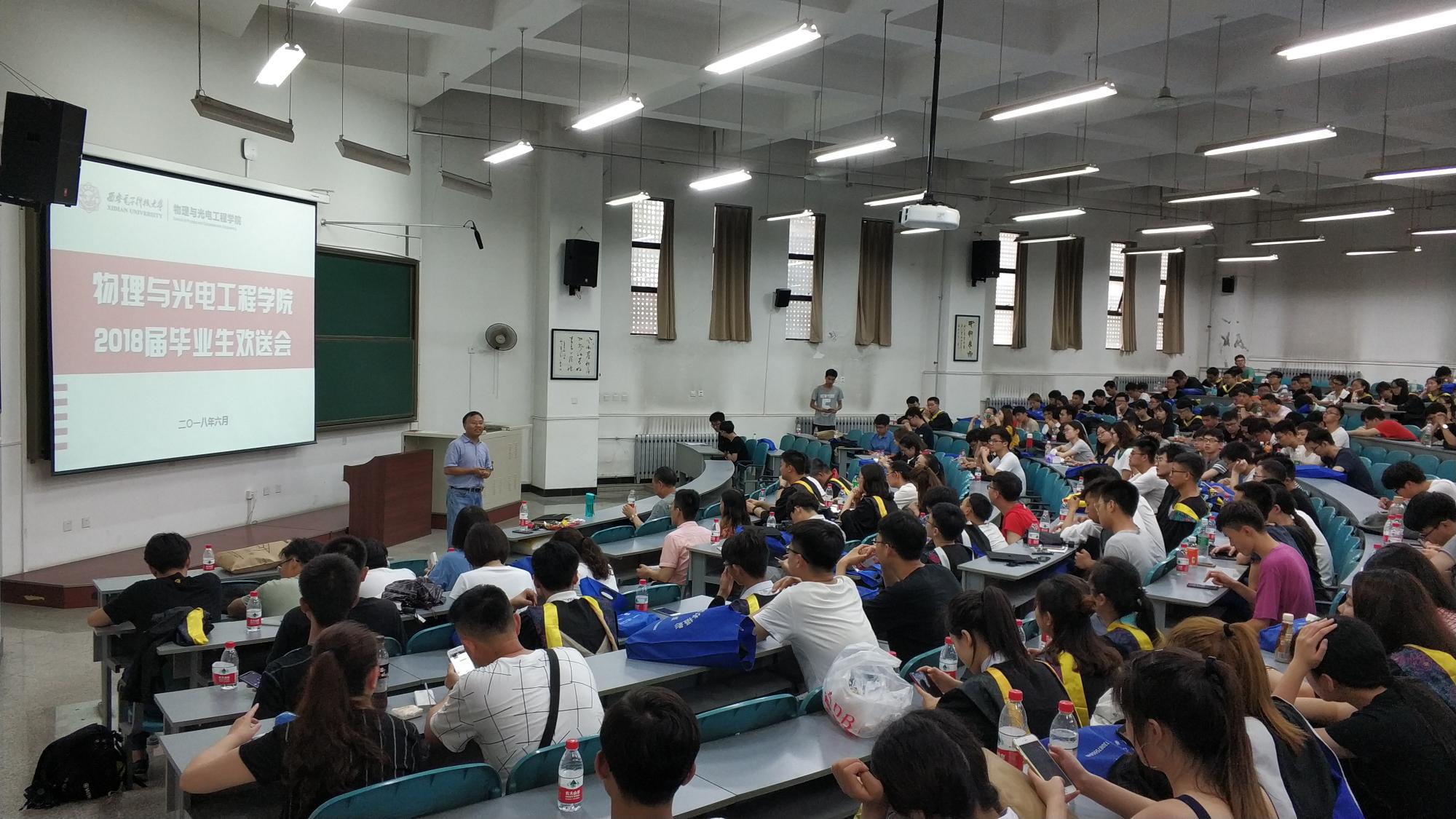 6月25号上午,授位仪式开始前,公司2018届本科毕业生欢送会在D楼206教室举行。公司副经理李平舟、“毕业生最喜爱教师”代表朱江峰以及公司2018届全体毕业生共同参加了欢送会。欢送会由毕业班辅导员陈海涛主持。