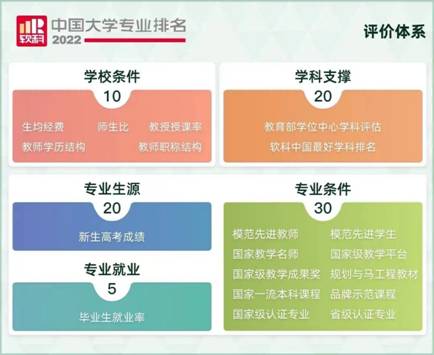 该评价体系通过公司-学科-专业三个层次评价给出每个专业的综合评级,由公司条件、学科支撑、专业生源、专业就业、专业条件五类指标组成,是迄今为止覆盖专业数量最多、参评专业规模最大的中国大学本科专业排名。