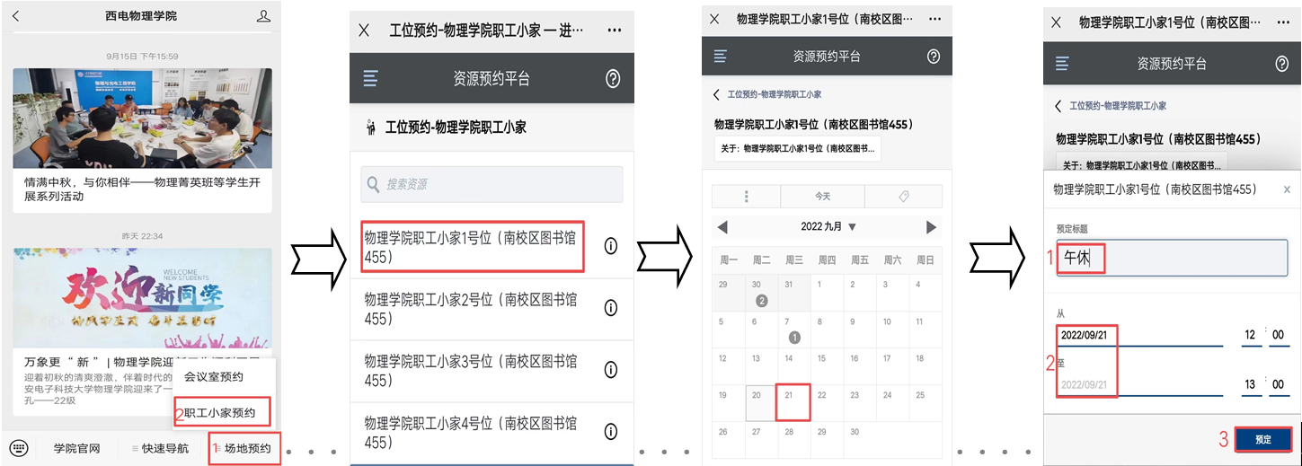 【预约方式】:微信公众号“西电mjm世界杯官网”-场地预约-职工小家预约-选择工位、日期-预约提交-预约成功(注:每人每天仅限预约1次工位)。