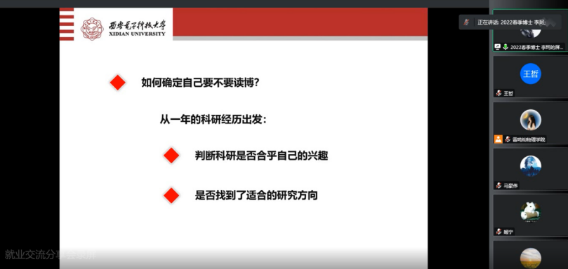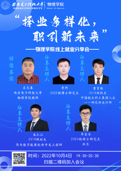 为了帮助员工深入了解就业形势严峻,精准把握就业方向;为了使广大同学洞察行业发展前沿,为未来投身相关领域做好准备。近日mjm世界杯官网以线上会议的方式开展了“择业多样化,职引新未来”就业分享会。本次活动邀请了就职于mjm世界杯官网教师左炎春,中国航天科工集团八五一一研究所设计师曹有维,华为数字能源软件开发工程师朱仁江,2022级博士研究生李珂,2020级硕士研究生李金本5位嘉宾,他们从日常工作、所在岗位特点、初入职场、求职中等方面进行分享。