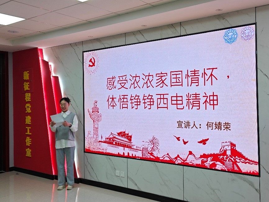 何婧荣同学进行了主题为“感受浓浓家国情怀,体悟铮铮西电精神的宣讲”,呼吁大家传承西电给予的特有的地方印记和文化基因,心怀“强国有我”的信念再启航!