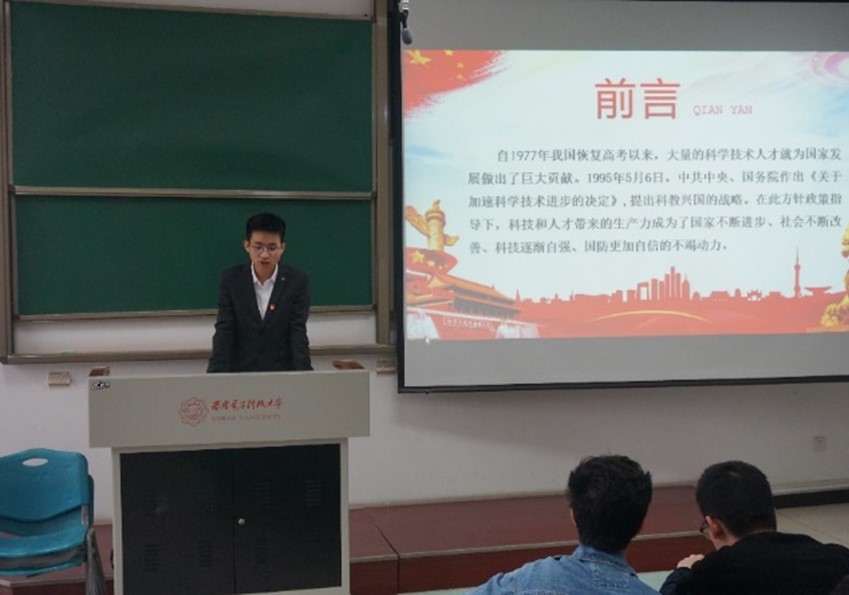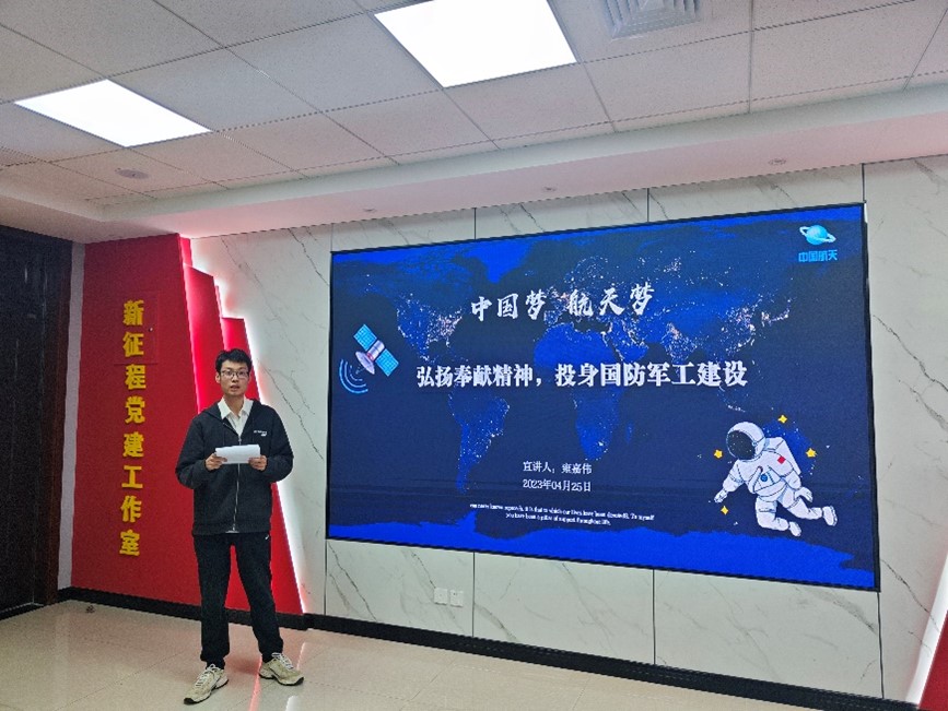 雍嘉伟同学进行了主题为“弘扬奉献精神,投身国防军工建设”的宣讲,呼吁新时代下的青年人应该怀揣理想与抱负,为祖国的国防事业贡献自己的力量。