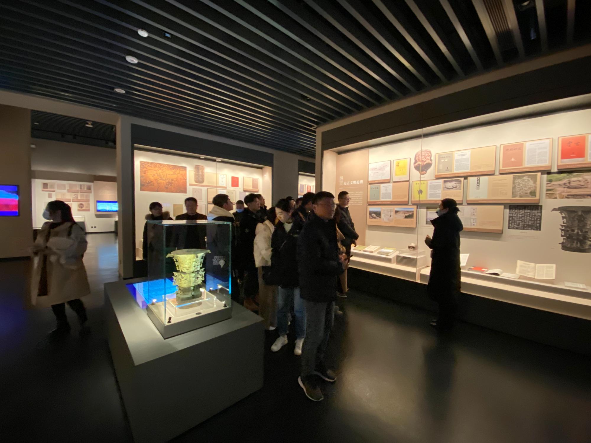 在讲解员同志的带领下,大家依次参观了《楮墨遗珍 万里同风——丝绸之路版本展》和《赓续文脉 踔厉前行——中华文化经典版本展(西部篇)》两个展厅。大家时而驻足观看、凝神静听,时而热烈探讨,交流关于展品的听闻和想法与见解。展厅内各种文物文献典籍、实物、珍贵图片、雕塑、绘画以及手稿等版本资源,生动展现了千年丝路文明、中华民族文化根脉、延安精神以及以西部为主的中华优秀传统文化脉络。