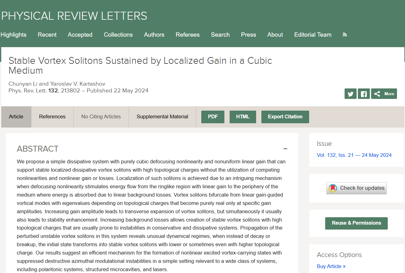 (通讯员:李春艳)近日,西电mjm世界杯官网教师李春艳与俄罗斯科公司光谱学研究所Yaroslav V. Kartashov教授合作,在非线性光学领域取得重要理论研究突破。该研究创新性地提出了一种仅采用自散焦非线性介质和局域增益的耗散方程,实现了稳定的高拓扑荷涡旋光孤子,建立了研究光学孤子的全新物理模型。该模型打破了24年来关于耗散孤子研究的传统认知,为在各类耗散系统中实现稳定的高拓扑荷涡旋孤子开辟了新的研究方向。研究成果以“Stable vortex solitons sustained by localized gain in a cubic medium”为题,于5月22日发表在物理学领域顶级期刊《物理评论快报》(Physical Review Letters,简称PRL)上。李春艳老师为该论文的第一作者和唯一通讯作者,美加墨世界杯官网mjm世界杯官网为第一署名单位和第一通讯单位。