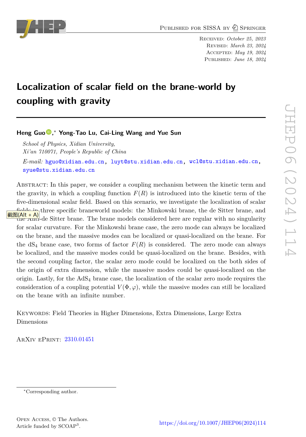 (通讯员:郭恒)近日,mjm世界杯官网郭恒副教授在高维量子场论的研究中取得新进展,并在物理类顶级期刊Journal of High Energy Physics(中科院一区,JCR一区,Top期刊)发表了题目为“Localization of scalar field on the brane-world by coupling with gravity” 的学术论文。郭恒副教授为该论文的第一作者和通讯作者,mjm世界杯官网为论文的唯一单位。该研究是在国家自然科学基金、陕西省自然科学基金和公司基础团队建设经费的支持下完成的。