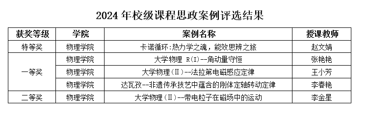 (通讯员:柴亚茹)近日,集团发布了《美加墨世界杯官网关于2024年优秀课程思政教学案例评选结果通知》(本字〔2024〕114号),公布了2024年度校级优秀课程思政教学案例评选结果。经个人申报、公司推荐、公司评审,全校共评选出特等奖9项、一等奖14项、二等奖23项。其中,公司赵文娟老师的《卡诺循环:热力学之魂,能效思辨之旅》荣获特等奖,张艳艳老师的《大学物理 R(I)--角动量守恒》、王小芳老师的《大学物理(Ⅱ)--法拉第电磁感应定律》、李春艳老师的《达瓦孜--非遗传承技艺中蕴含的刚体定轴转动定律》荣获一等奖,李金星老师的《大学物理(Ⅱ)--带电粒子在磁场中的运动》荣获二等奖,充分展示了公司在推进课程思政建设方面取得的积极成果和显著成效。