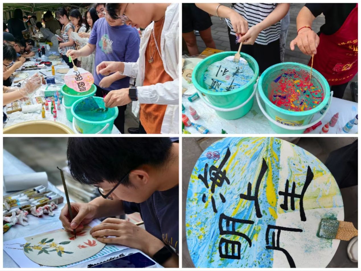 漆扇是由江苏非遗大漆工艺创新而来的一种技艺,将几种颜色的漆料滴于水中,轻微搅拌后再将白色扇面放入水中,经过旋转、轻摇、摆动,就可以获得一幅独一无二的扇面图案。同学们以漆为媒、以扇为纸,秉笔颂春秋、落墨寄相思。同学们在现场工作人员的指导下,以点、甩、弹、划等手法,在水面绘出图案效果,再晕染在扇面。漆染之后的扇面一半人为,一半天成,各有千秋、张弛有度,每一把都是独一无二的艺术品。