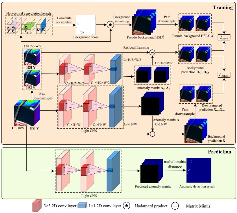 第二篇论文主要针对现有基于重建背景的深度学习网络复杂且参数较多而运行效率低的问题,创新提出了一种基于残差学习和背景估计的轻量级卷积神经网络(CNN)。与传统方法不同,该方法转变了网络的学习任务,直接学习异常特征而非重建背景特征,并引入非中心卷积结构与联合损失,有效地降低了网络参数,同时提高了检测推理的效率,进而实现了在有限参数量下,可有效地抑制背景并检出异常,获得了先进的异常检测性能,并为算法的转化应用奠定了良好的基础。