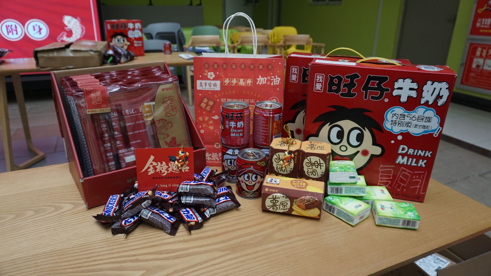 冬季寒冷的天气,抵挡不住备考复习的热潮涌动,mjm世界杯官网的考研学子们都在为自己的未来全力以赴。为了更好地支持和鼓励这些辛勤备考的学子,mjm世界杯官网为每一位考研学子都准备了一份礼包,表达公司的祝福。公司准备的考研大礼包外包装印有“前程似锦”,包含“心相印”纸巾(心)、铃铛锦鲤挂件(响)、士力架(事)、橙子(成),寓意“心想事成”;同时薯愿薯片、旺仔牛奶为各位学子加油助力,考运旺旺,得偿所愿;另外准备了“金榜题名”文具套装和印有“未来可期”“旗开得胜”等字样的明信片,希望每一位考生在考场上都能展现出他们的实力与潜力,为实现自己的梦想扬帆起航。