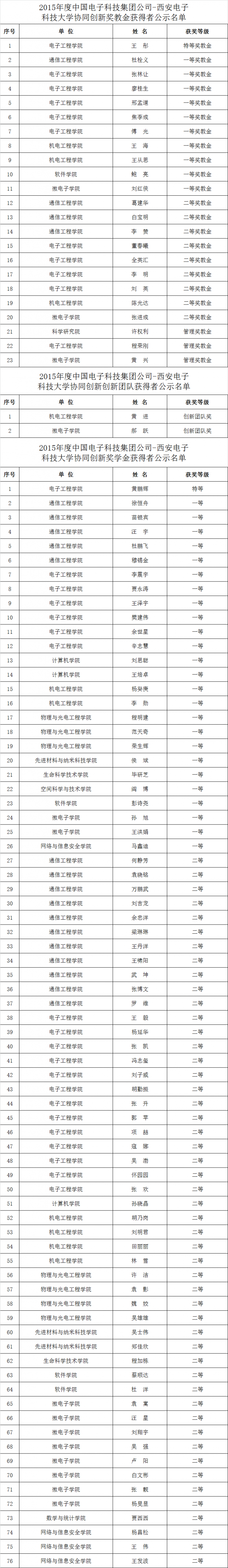 2015年度中国电子科技集团公司-美加墨世界杯官网协同创新奖教金获得者公示名单