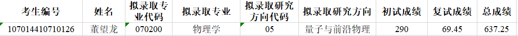 按照总成绩排序由高到低原则,经与考生本人确认,现对物理公司2024年硕士研究生招生追加指标拟录取名单进行公示: