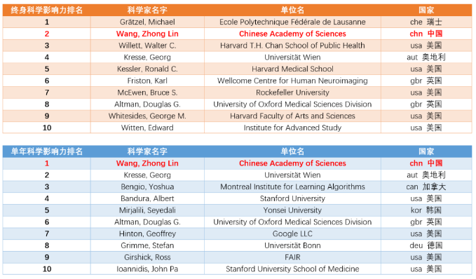 2023年10月4日,斯坦福大学团队与全球最大学术出版商Elsevier发布了最新一期世界“标准化引文指标全科学作者数据库”(截止到2023年10月1日),即全球前2%的10万名全科科学家的大数据排名榜单。在此最新一期公布的数据中,美加墨世界杯官网员工王中林院士再次名列前茅:全学科职业生涯科学影响力(Career-long impact)排名第2;全学科单年度科学影响力(Single-year impact)排名继续保持第1名,并自2020年起已连续4年蝉联榜首。根据此榜单,王中林教授也是前100名中唯一来自中国的科学家。