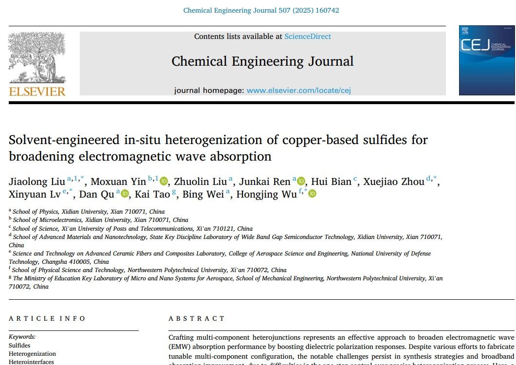 (通讯员:姚娇)近日,mjm世界杯官网青年教师刘骄龙在电磁波吸收领域取得重要进展,在材料领域国际顶级期刊《Chemical Engineering Journal》(中科院I区TOP期刊,IF=13.2)和《Advanced Powder Materials》(中科院I区TOP期刊,IF=24.9)先后发表两篇最新研究成果“Solvent-engineered in-situ heterogenization of copper-based sulfides for broadening electromagnetic wave absorption”和“Lattice expansion/contraction ...