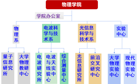 公司建立“三系三所六中心”,其中三系为物理系、电波科学与技术系*、光信息科学与技术系*;三所为量子信息研究所*、电波研究所、光信息研究所*;六中心为电波与天线实验中心、综合测量中心*、前沿交叉中心*、大学物理教研中心、大学物理实验中心、现代物理实验中心,带“*”为新增机构。